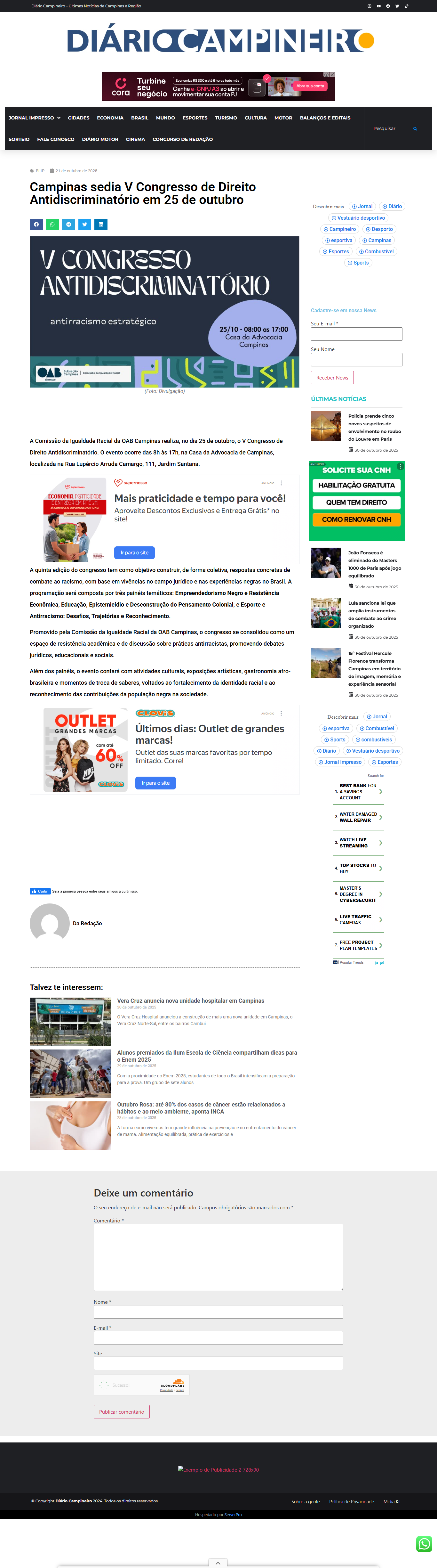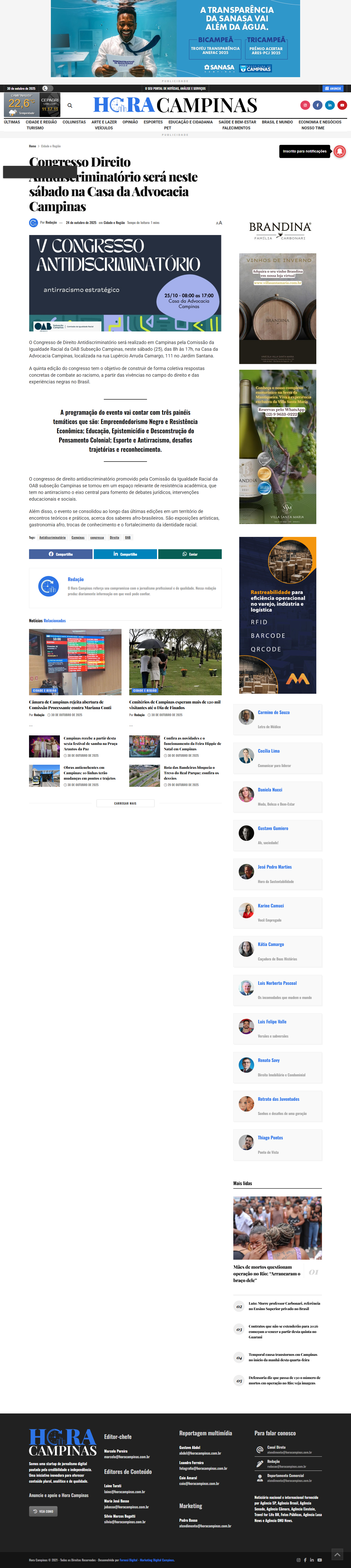 O V Congresso de Direito Antidiscriminatório será realizado em Campinas pela Comissão da Igualdade Racial da OAB Subseção Campinas no dia 25 de outubro dás 8 horas às 17 horas na Casa da Advocacia Campinas na rua Lupércio Arruda Camargo, 111 no Jardim Santana.